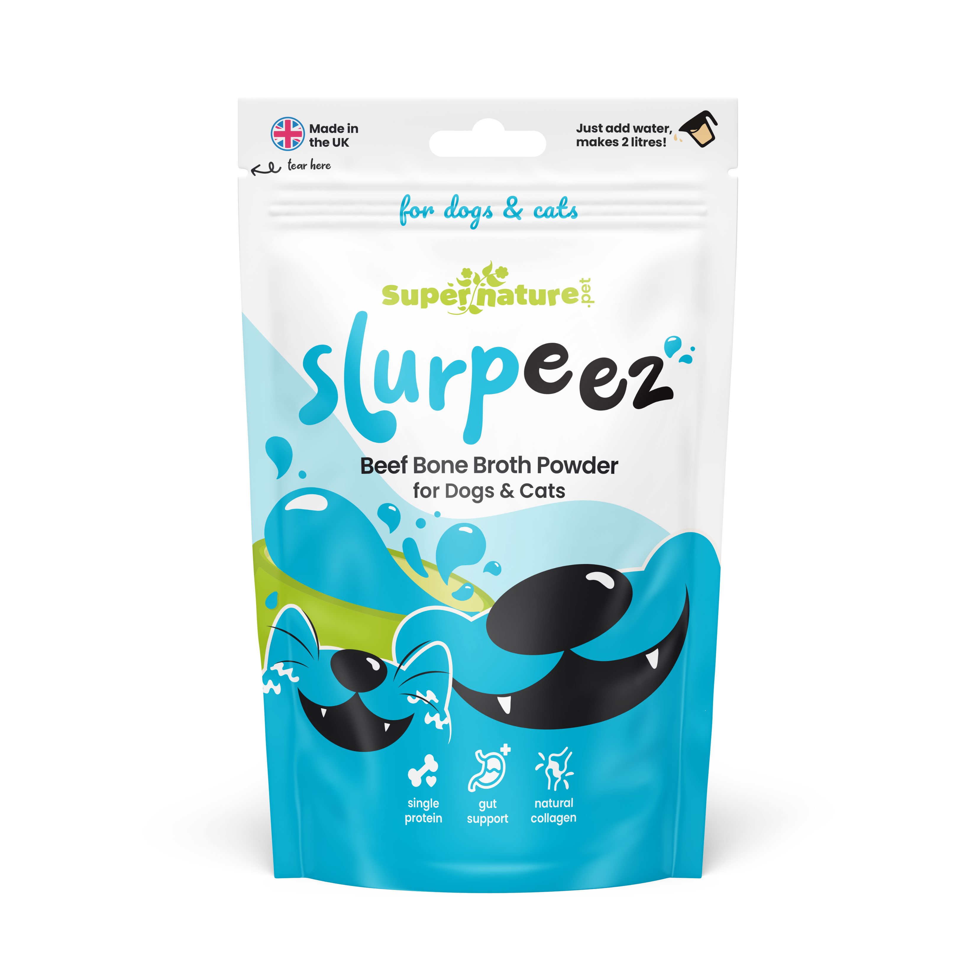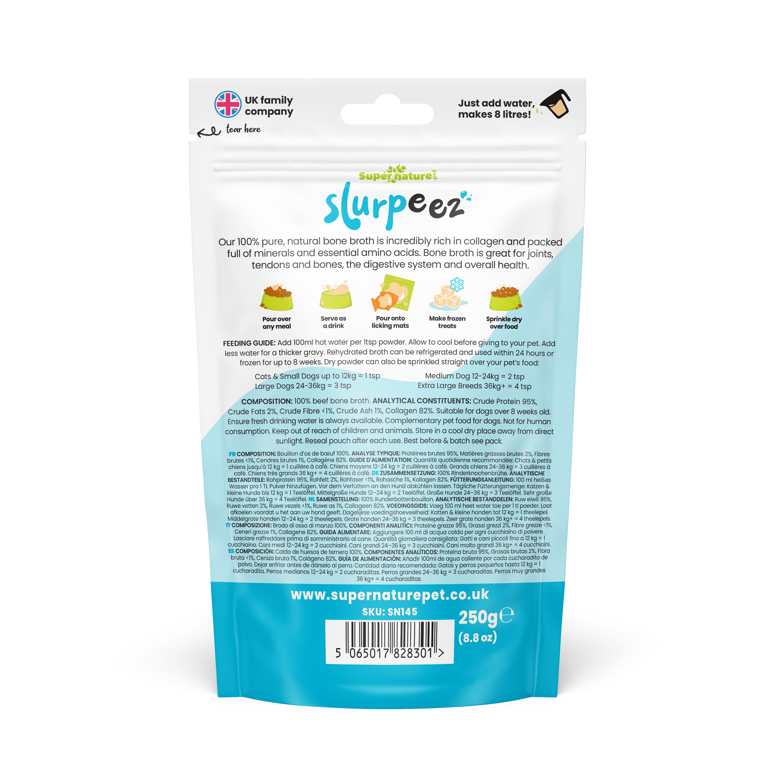 Add 100ml hot water per 1 tsp powder. Allow to cool before giving to your dog. Add less water for a thicker gravy. Rehydrated broth can be refrigerated and used within 24 hours or frozen for up to eight weeks. Dry powder can also be sprinkled straight over your dog’s food.
