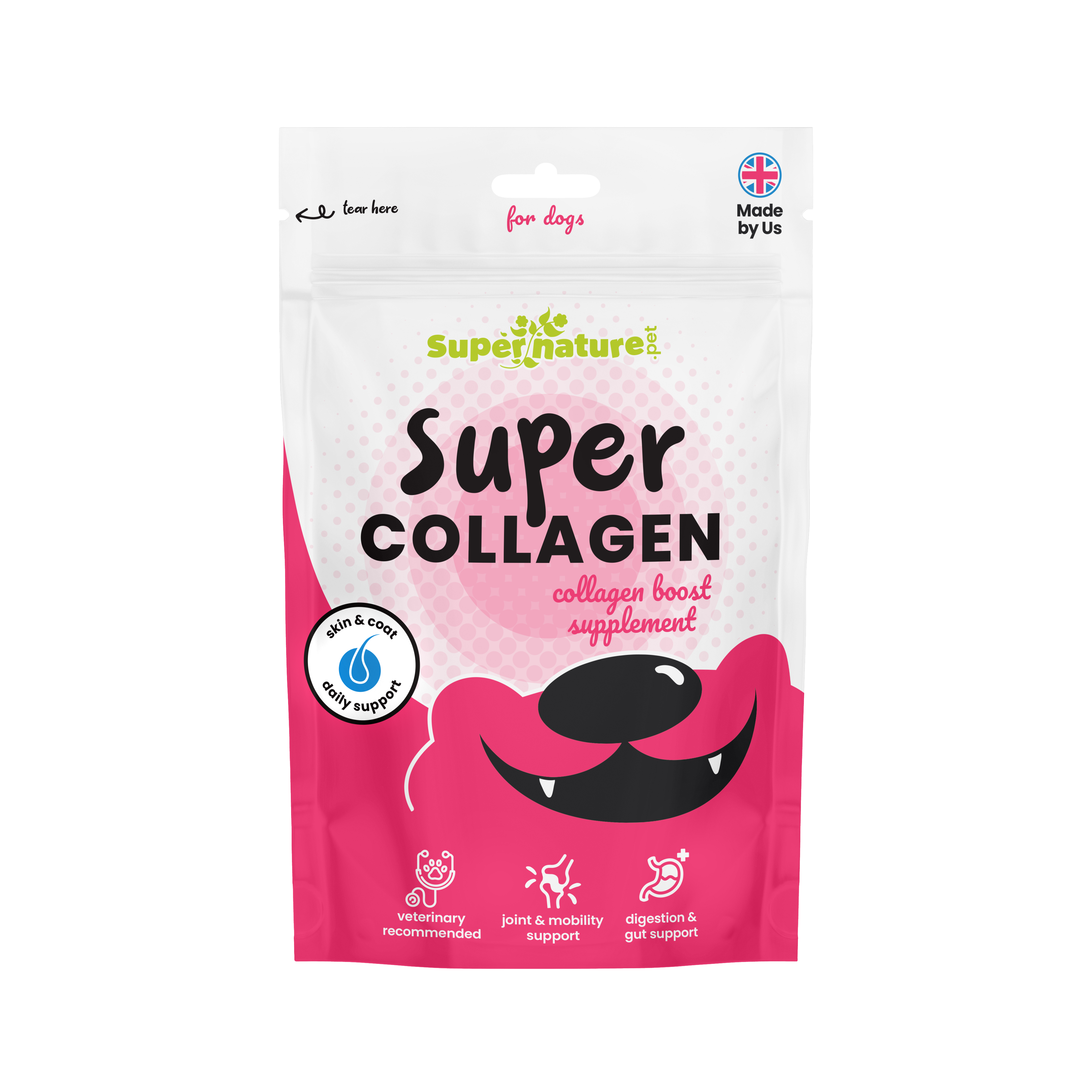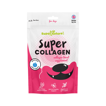 strength to various body parts. Dogs produce less collagen as they age which can lead to various health issues such as joint pain, reduced mobility, and skin problems. Super Nature Super Collagen Boost Supplement helps replenish your dog's naturally diminishing levels to support mobility & overall wellbeing. Crafted exclusively from 100% pork, Collagen Boost is an excellent single protein source supplement. With its high palatability, and boasting over 85% protein content, this supplement is a great addition to the diet of all dogs.